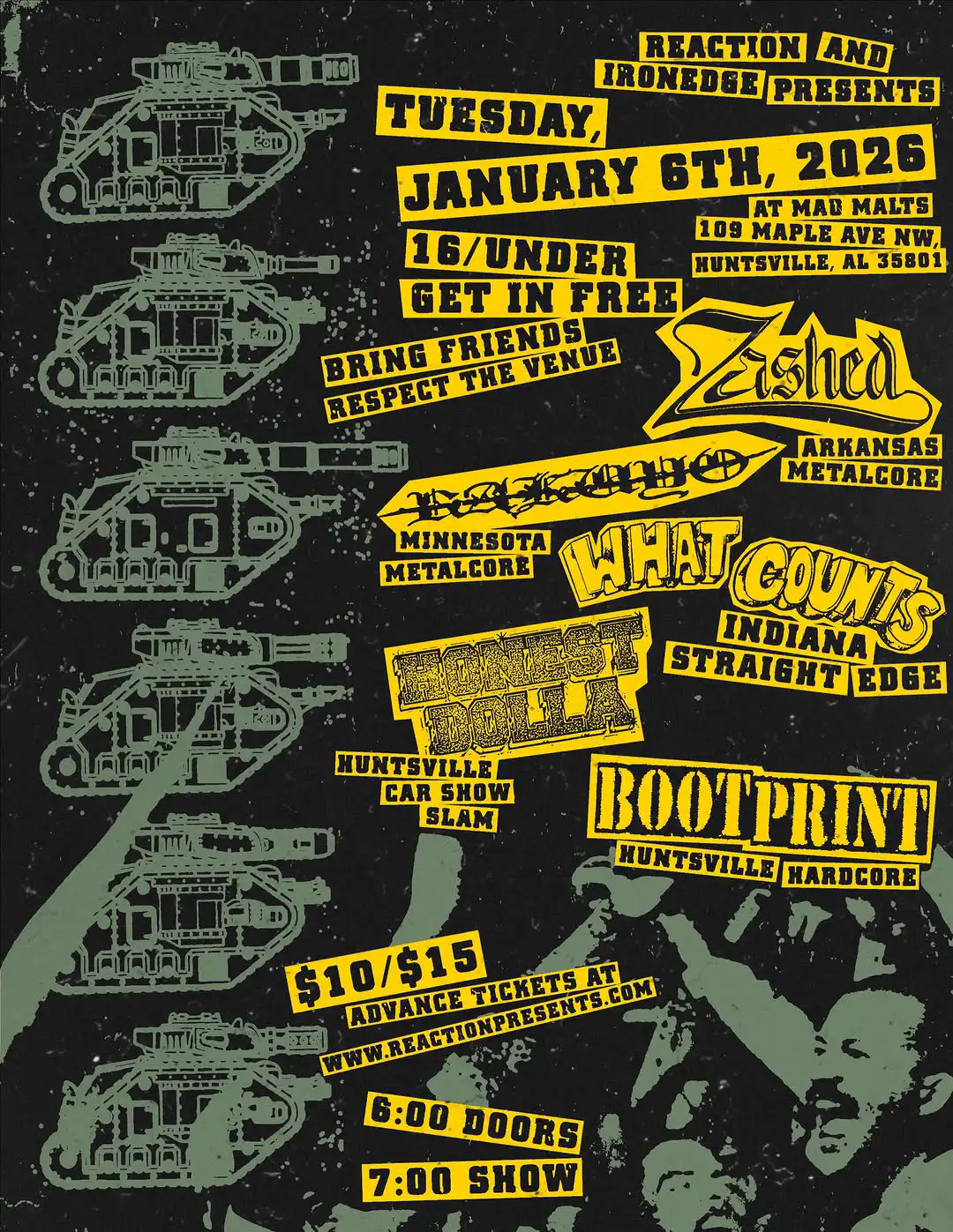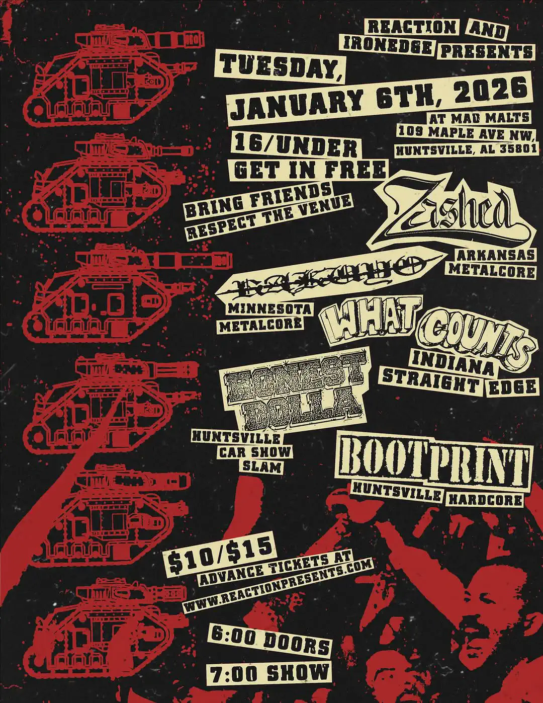 community and teamwork makes for a sick show that i’m excited to be involved in 😊✨ i’m bringing indiana straight edgers what counts and blaythe is bringing arkansas and minnesota metalcore rockers zashed and rakuyo to huntsville 😀 this is how hardcore is done 😃 local rockers honest dolla and bootprint will head the charge on this gig see yall in january 😄