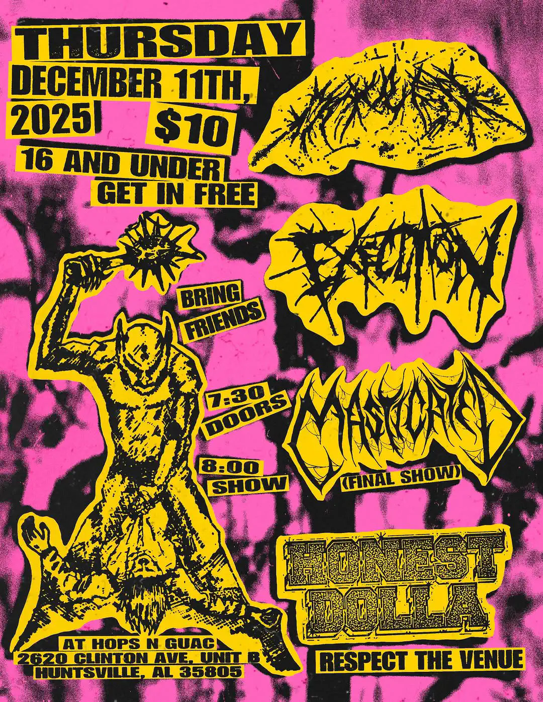 YO coming up quick, we have an official Deathcore & Tacos 🌮 event in the great city of Huntsville, Alabama. Thursday, December 11th at Hops N Guac. Bring your friends. Respect the space 🫶. Let’s give Masticated a fun goodbye 🥲