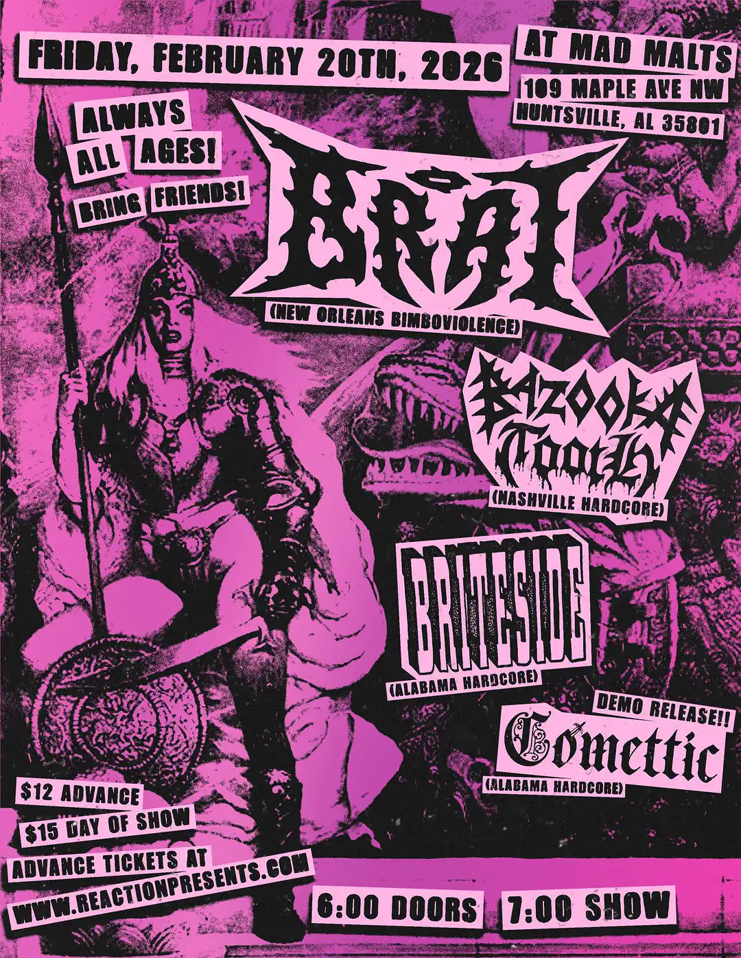 Brat in Alabama Friday February 20th 🤸♀️🤸♀️🤸♀️ See yall at Mad Malts with Bazookatooth, Briteside, and Comettic, who will be releasing their demo at this show.