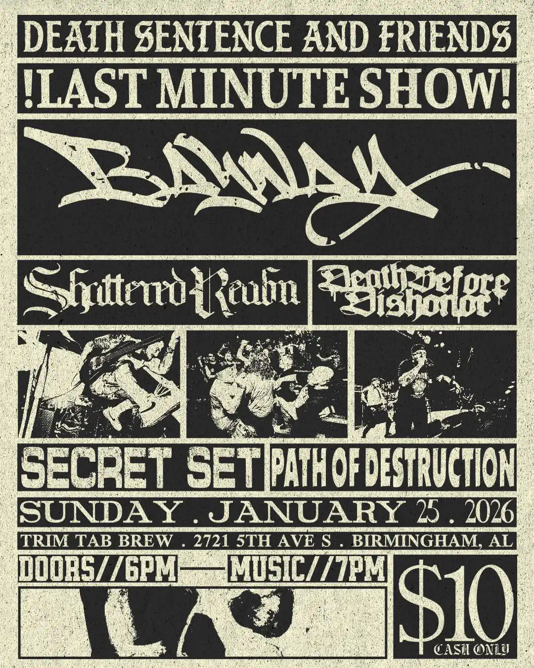01252026 - LAST MINUTE SHOW ~ ON SUNDAY $10 FOR THIS SHOW *CASH ONLY* - @baywaynj @shatteredrealm86 @deathbeforedishonorbhc @xpathofdestructionx +SECRET SET - @alabamahardcore - FLYER BY @temperatevisuals