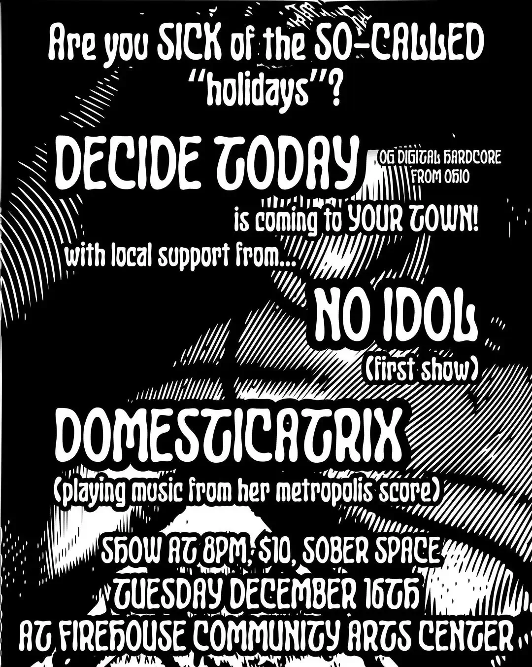 Are you sick and tired of the holidays? Come on out and see Cincinnati’s own @realicide (DECIDE TODAY) with NO IDOL and Domesticatrix this Tuesday! Be there!