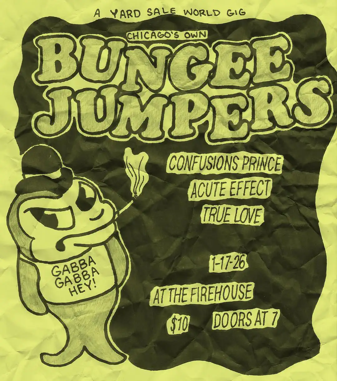 Badass hardcore punk rock n roll gig with BUNGEE JUMPERS (members of every band) from Chicago! With locals CONFUSION’S PRINCE (slam), ACUTE EFFECT (pogo) and new-ish local rockers TRUE LOVE (bang your fuckn head) That’s everyone’s favorite fish, Small Fry on the flyer. Everyone’s favorite fish for everyone’s favorite show! You’ll love it!