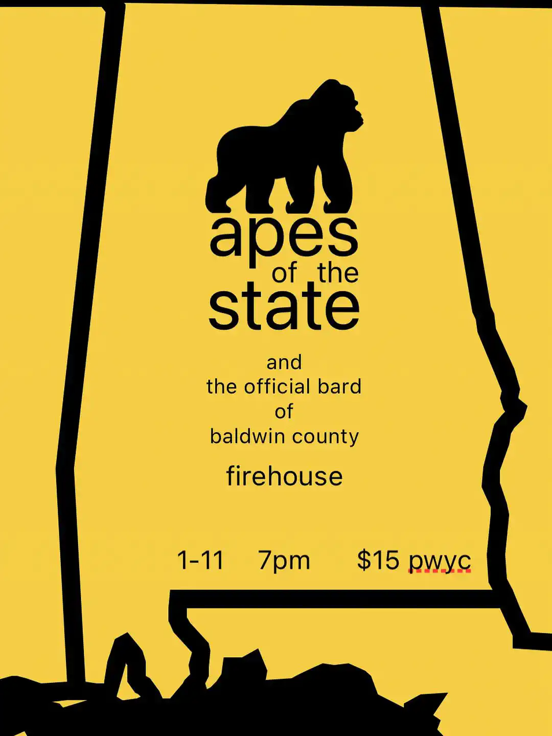 🦍🦍🦍 TONIGHT 🦍🦍🦍 Real-deal modern folk punk legends APES OF THE STATE hit Birmingham’s oldest DIY spot for a legendary night…. Featuring the south’s darling THE OFFICIAL BARD OF BALDWIN COUNTY. This is a big one…. Do not miss!! TONIGHT!!!