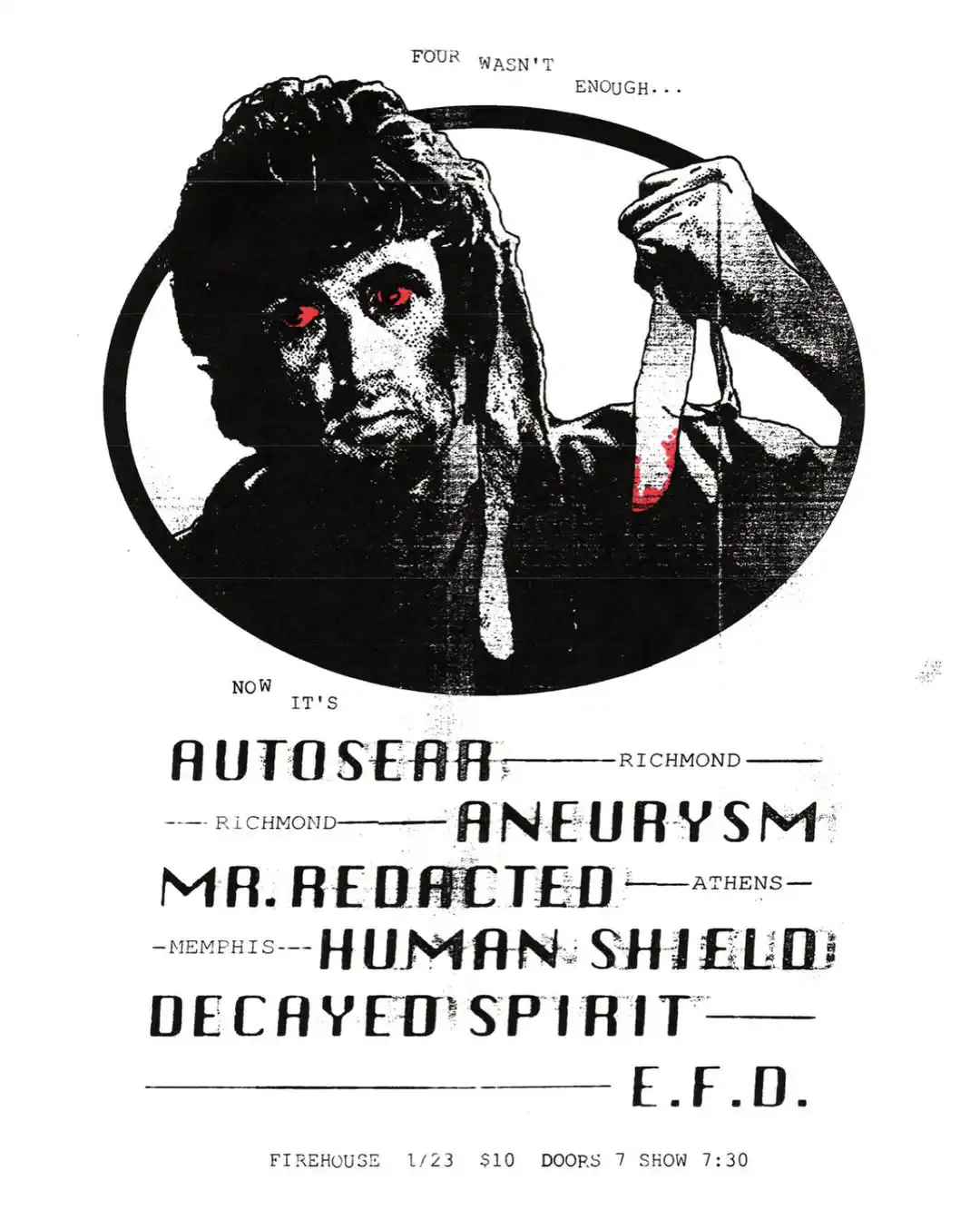 2025 IS DONEZO!!!!! 2026 is bringing in a rage filled gig with Auto Sear and Human Shield!!!! You know the Punk/Power Violence mix bill means this one is an instant Bham Classic so don’t miss out. Starting the year off right with this behemoth of a show. Supporting the gig will be the dirtiest bunch of fools Decayed Spirit and E.F.D