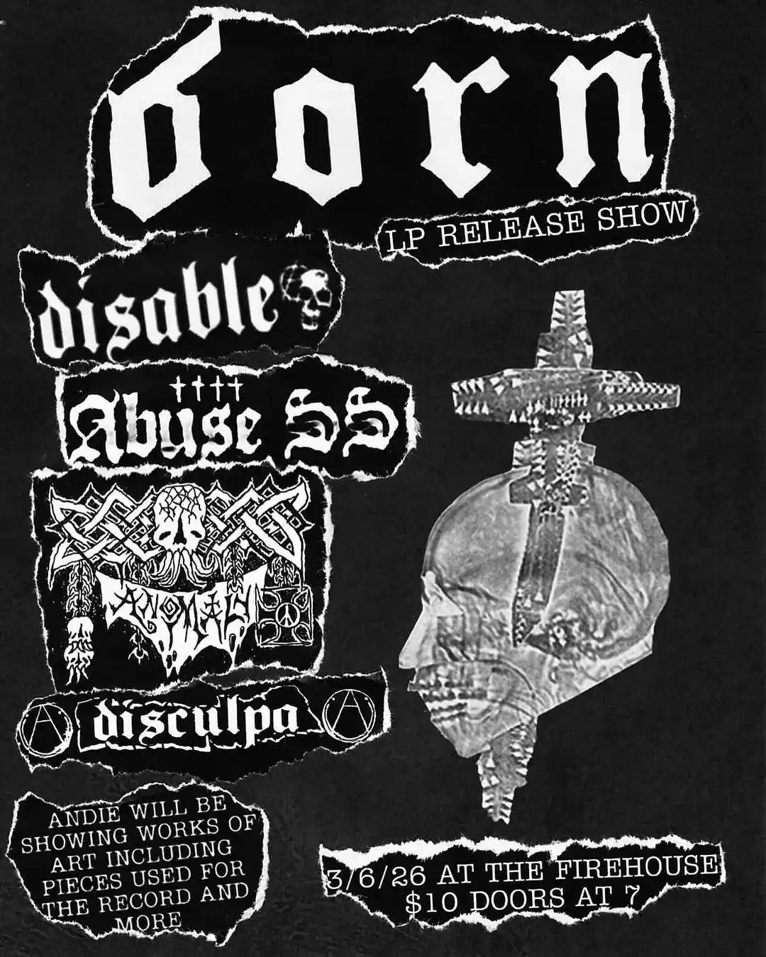 🚫🎶SOUTHEASTERN D-BEAT RAW PUNK ASSAULT ON FIREHOUSE🎶🚫 Friday 3/6 we are celebrating the release of the new B.O.R.N. 12” in style… with support from Atlanta’s DISABLE (if you were at Warzone Weekend you know what’s up…), Murfreesboro new noize ABUSE SS, Birmingham crust torchbearers ANOMALY,, with new Birmingham noise psychos DISCULPA. B.O.R.N. will have copies of the new 12” and some other goodies, turn up and bring earplugs Art by Andie, flyer by BJ