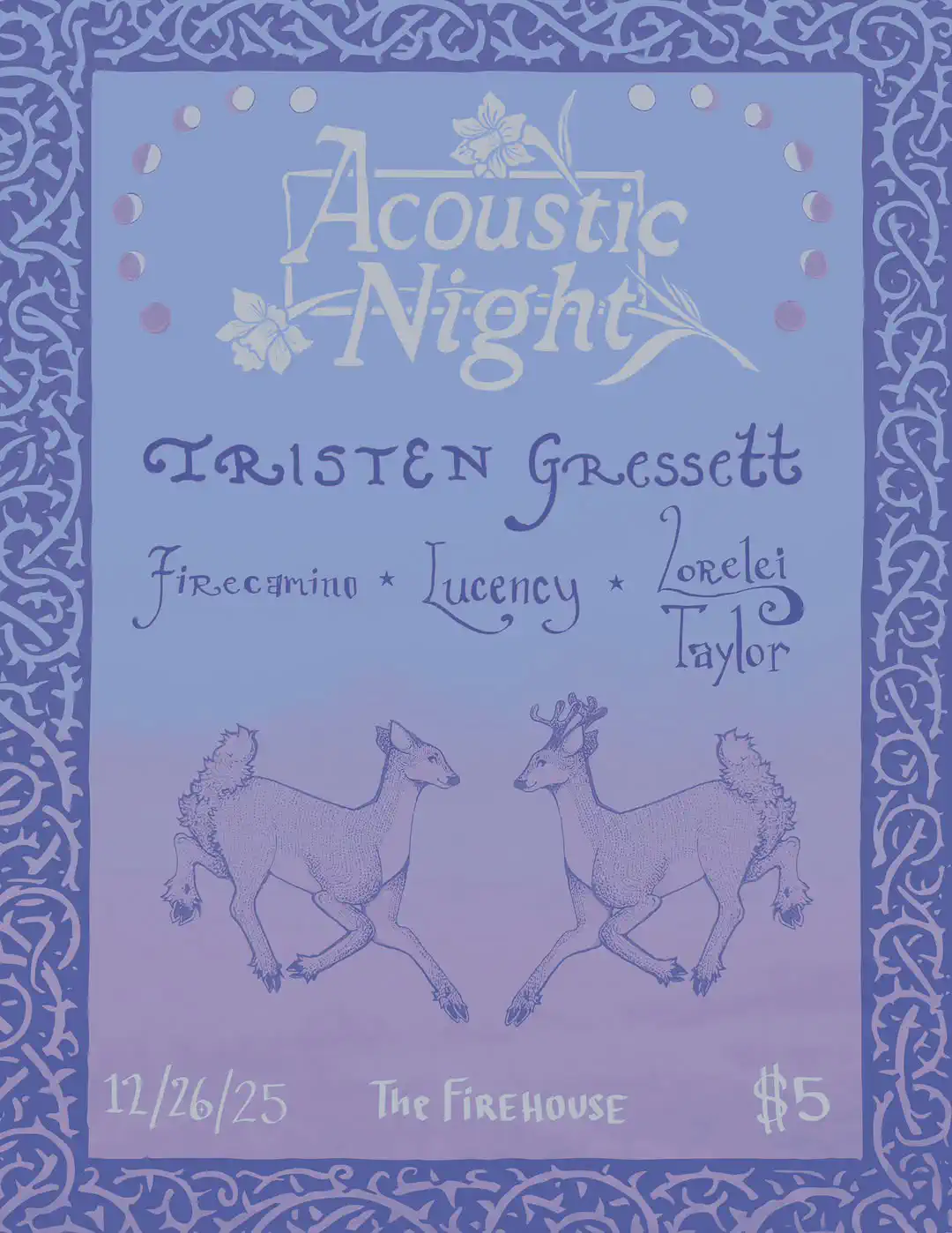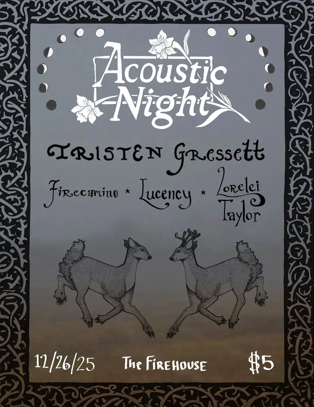DOORS 6 🕕 MUSIC 7 🐰👉🕖 Holidays got ya down? Family can't cook like they used to? We've got a nice and cozy $5 Friday night show with some incredible acoustic acts! Featuring @tristengressettmusic making his Firehouse debut, supported by @firecamino, @lucencyband, and @hyp0.girl (playing her first solo set!) Hot chocolate will be sold. Don't forget to bundle up 🥶 Tristen is an incredible songwriter & musician (and former American Idol contestant, and Alabama Music Hall Of Fame honoree) originally from Pell City, AL, 15 minutes from where I grew up. St. Clair County is not particularly known for our talent but he has consistently managed to blow the competition out of the water. His latest set is available to watch on my channel. Hope to see you all there 🫶