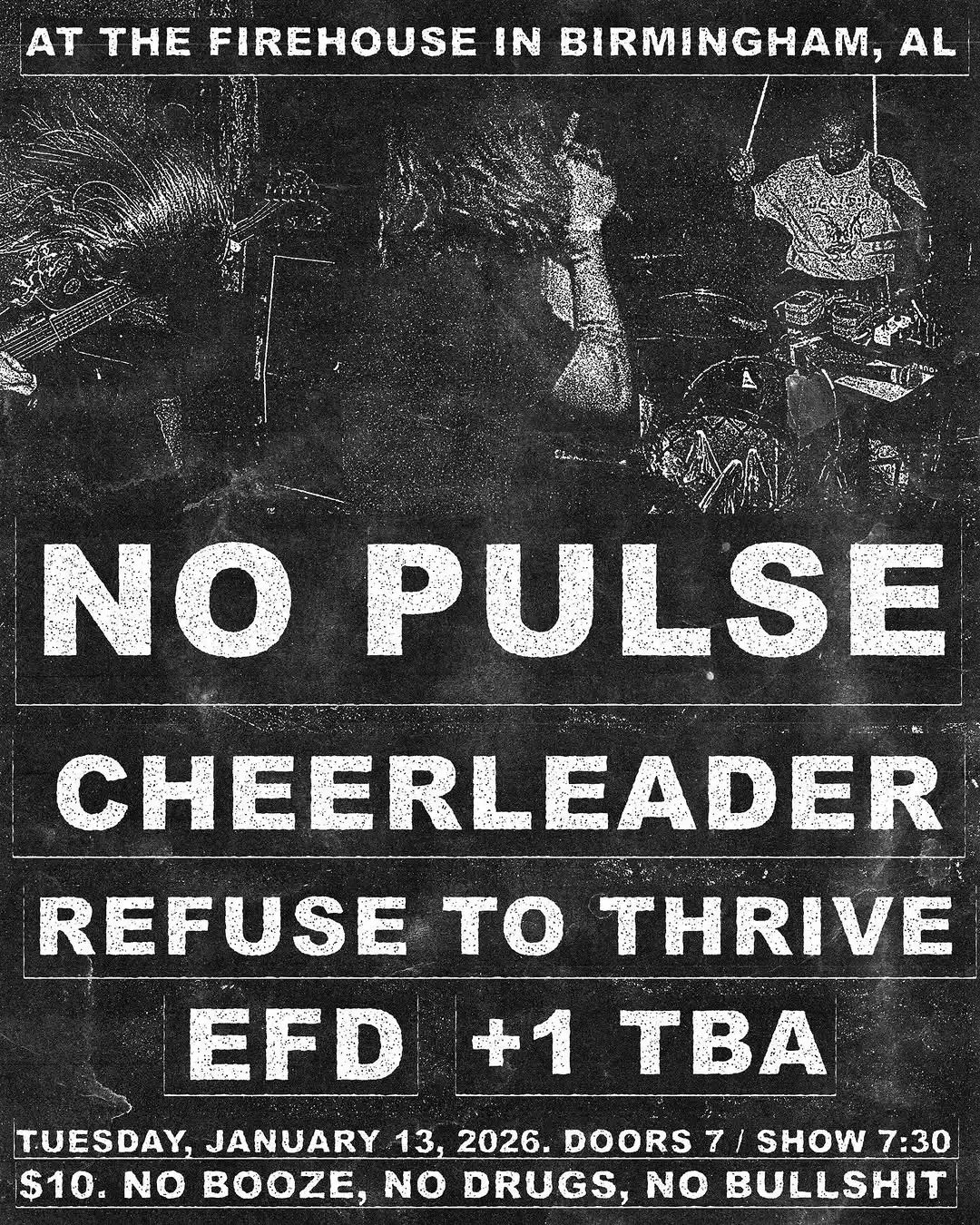 🔇🔇🔇FREE SHOW🔇🔇🔇 Saturn has done it again…. Another FREE offering of psycho all-local punk/hardcore/powerviolence/whatever… B.O.R.N. Is gearing up for their new record, as well as more attempts to hit decibel limits worldwide,, REFUSE TO THRIVE is gonna school yall on what it means to play fast, and a brand new band EFD makes their heinous debut (featuring members of Snake Church, RTT, Tractor, Joyboy and more…). EARLY SHOW so you got no reason to miss it! Bands start PROMPTLY at 4 and will move quick, so don’t blink or you’ll miss it! Lots of crazy stuff coming up in bham so keep your eyes up!