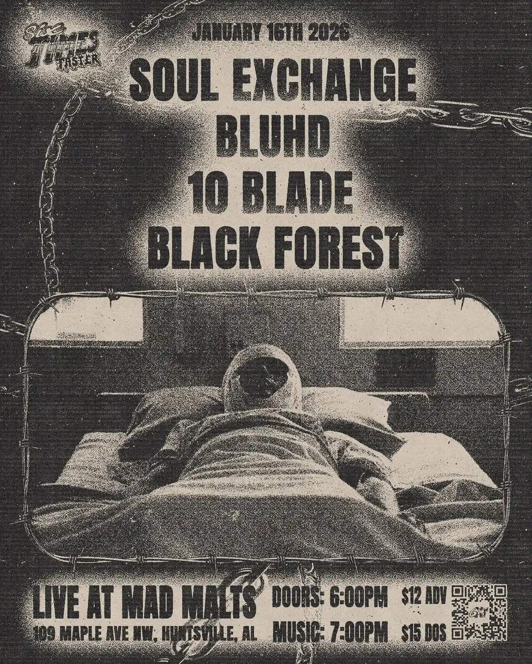 LAST MINUTE ANNOUNCEMENT! The first 6XF show of the year is kicking off on Friday, January 16th! SOUL EXCHANGE on tour from Texas. Local support from BLUHD, 10 BLADE, and BLACK FOREST. Tickets available NOW at www.seetickets.us/soulexchangehsv 🎨: @madebyslade