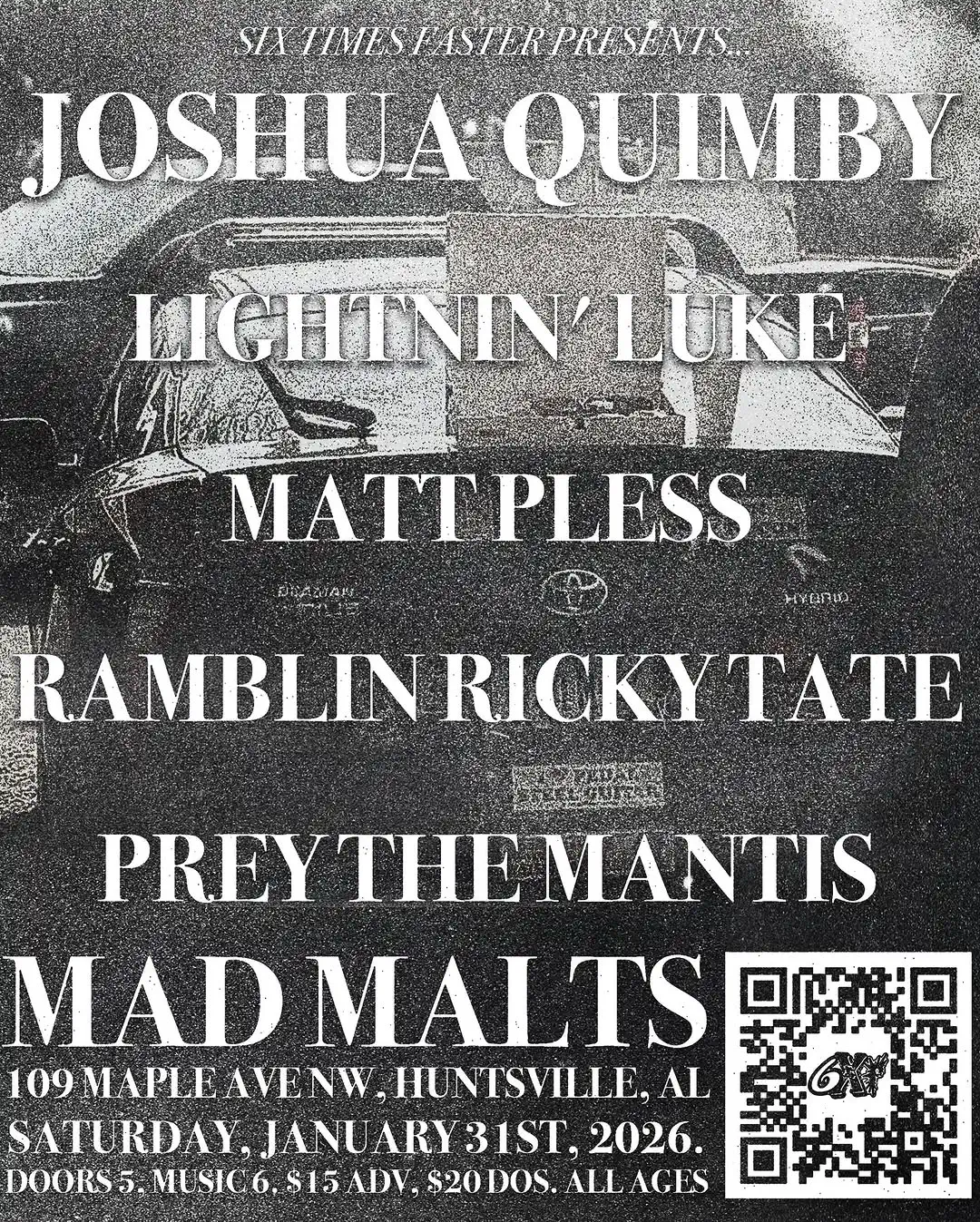 Updated flyer for January 31st at Mad Malts! Adding Hunter Bobby in place of Prey The Mantis! QUIMBY, LUKE, MATT, RICKY, HUNTER. Tickets STILL available at www.seetickets.us/joshuaquimbyhsv 🎨: @stompedxstamped
